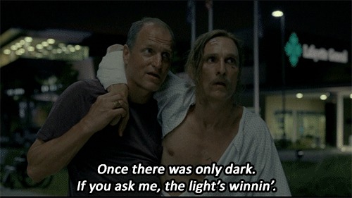 “We all got what I call a life trap, this gene-deep certainty that things will be different, that you’ll move to another city and meet the people that’ll be the friends for the rest of your life, that you’ll fall in love and be fulfilled. Fucking fulfillment and closure, whatever the fuck those two… Fucking empty jars to hold this shitstorm, and nothing is ever fulfilled until the very end, and closure…No. No, no. Nothing is ever over.” Detective Rustin Cohle