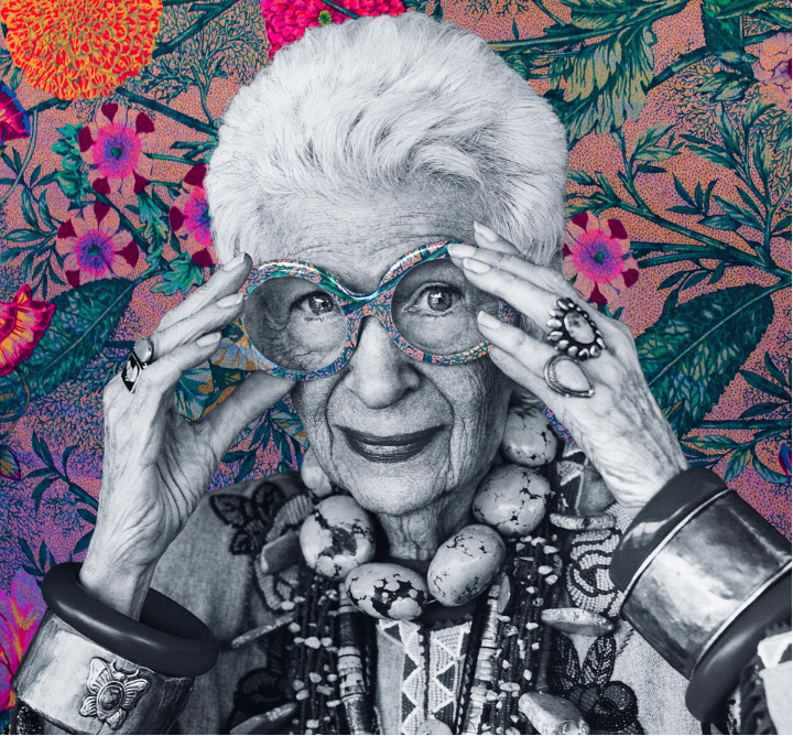 100 in the film — started out as interior designers, traveling the world every year collecting fabrics, knick-knacks and furniture that they used in refurbishing all sorts of grand manors, including the White House. Then they started their own fabric company, while Iris cultivated her fashion style.