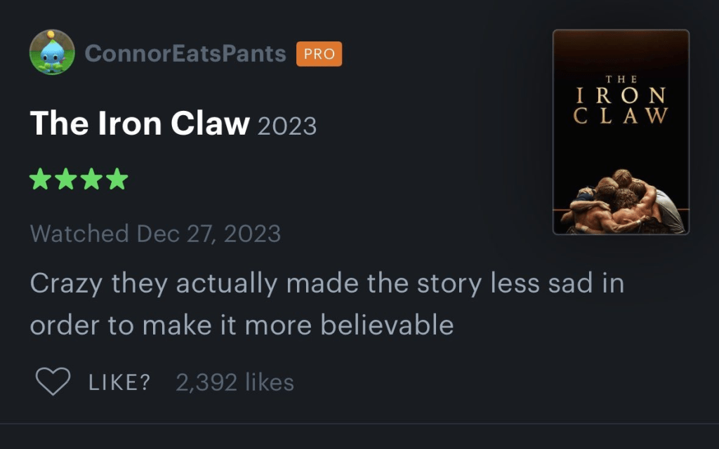 The Iron Claw may have released too late in the year for Golden Globe nominations, but don’t sleep on the fact that it may possibly be an awards contender for the Oscars this March. It was named one of the top 10 films of 2023 by the National Board of Review, alongside the likes of Oppenheimer, Past Lives, and Poor Things.
